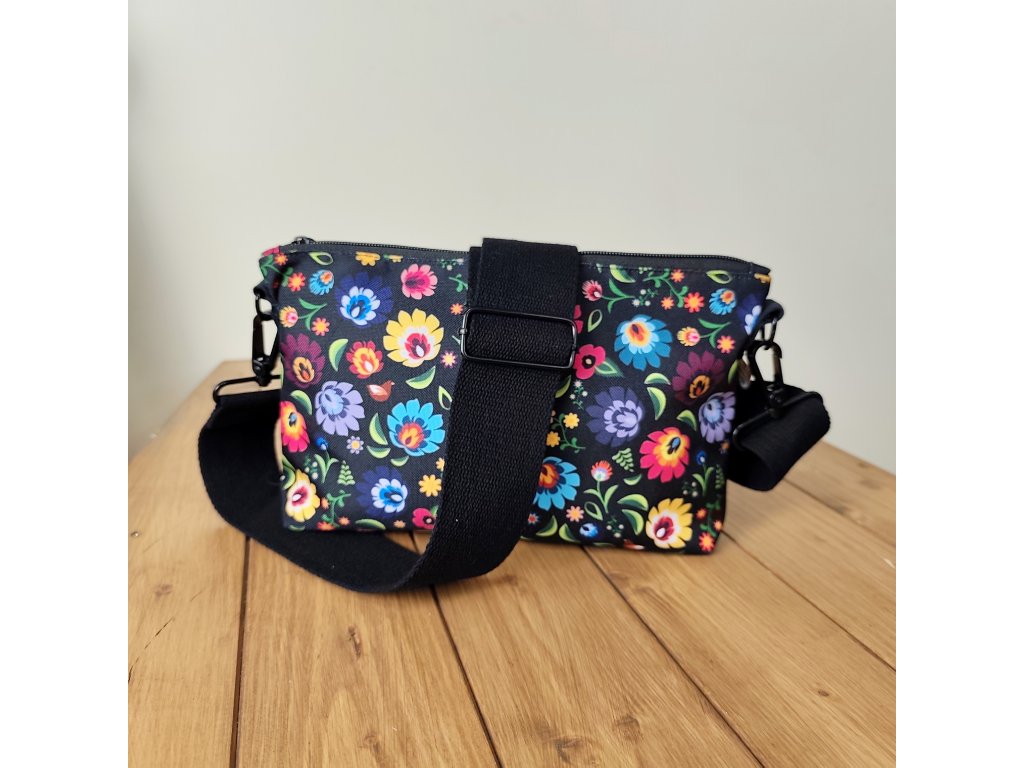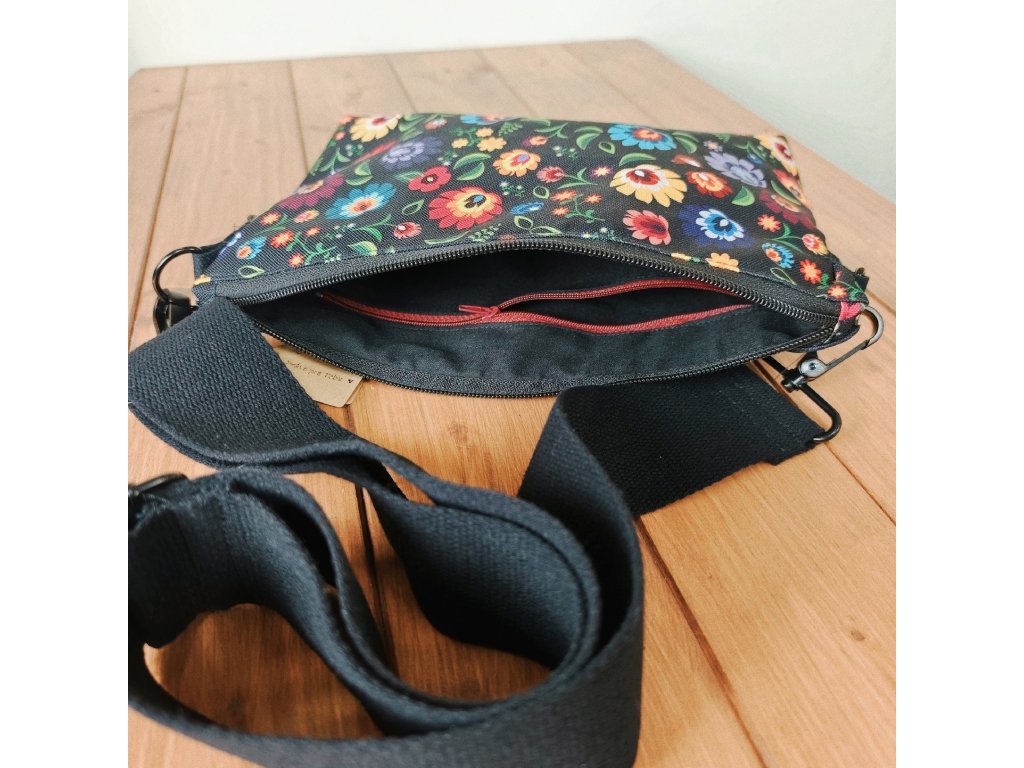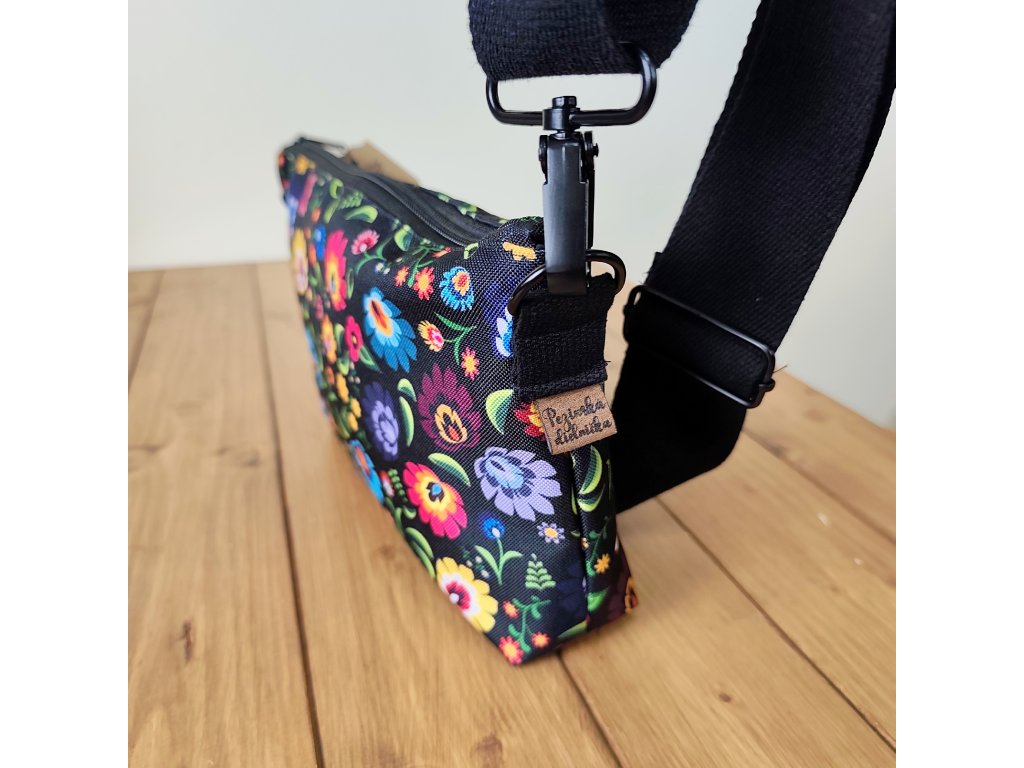 Kabelka s vymeniteľným popruhom, ušitá z nepremokavej látky. Podšitá, spevnená, s vnútorným vreckom na zips. Popruh sa na kabelku pripája s atraktívnymi kovovými karabínkami. Popruh je nastaviteľný a má šírku 5 cm.
