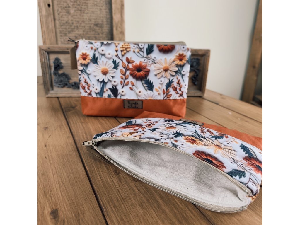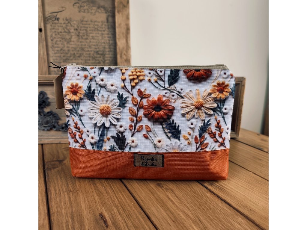 Krásny, dizajnový kúsok - kozmetická taštička s kvietkovým dizajnom. Ručná práca, materiál od slovenského výrobcu a vyrobené v našej dielničke našimi šikovnými dievčatami. Je nepremokavá, z vnútra podšitá bavlnenou látkou a spevnená výstuhou. Táto kozmetická taštička je vhodná ako darček pre Vašich blízkych.