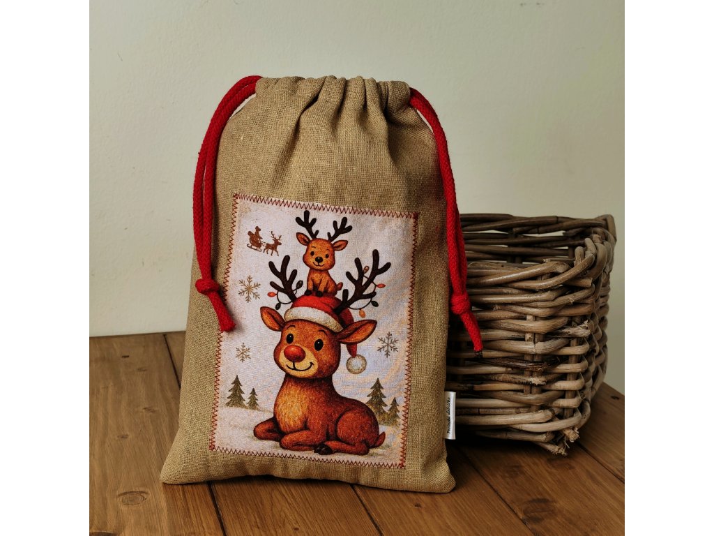 Textilné Mikulášske vrecko na mikulášske dobroty. Sú to výnimočné vrecká, pretože obrázok Sobíka na vrecku namaľoval náš kamarát Tibi (11 ročný) - maľovanie je jeho veľkým koníčkom. A tieto namaľované obrázky sme dali do tlače na textil a kolegyne Maťka a Evička nám z nich ušili takéto krásne vrecká.